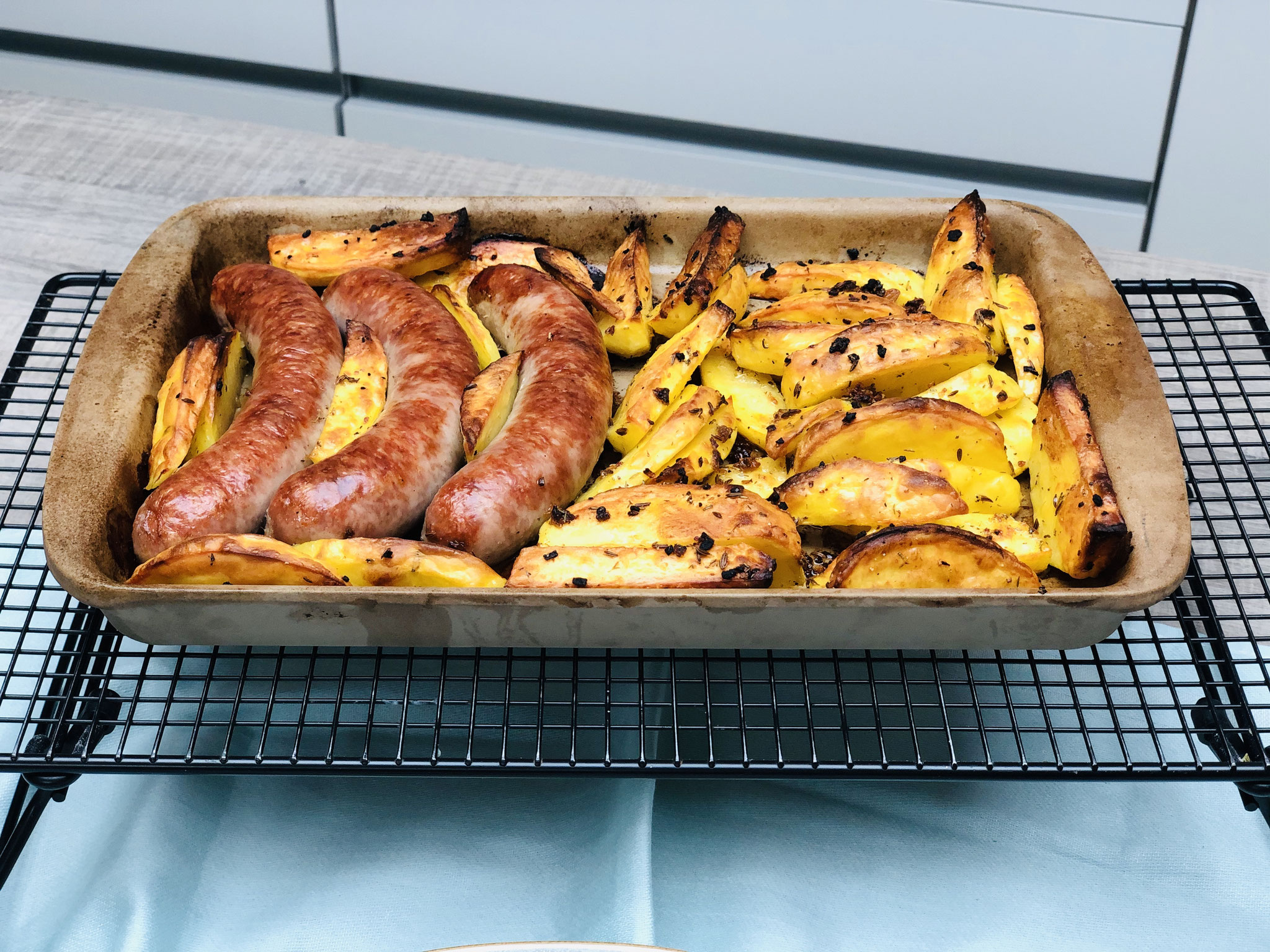 Wurstchen Susskartoffeln Und Bohnen Aus Dem Ofen