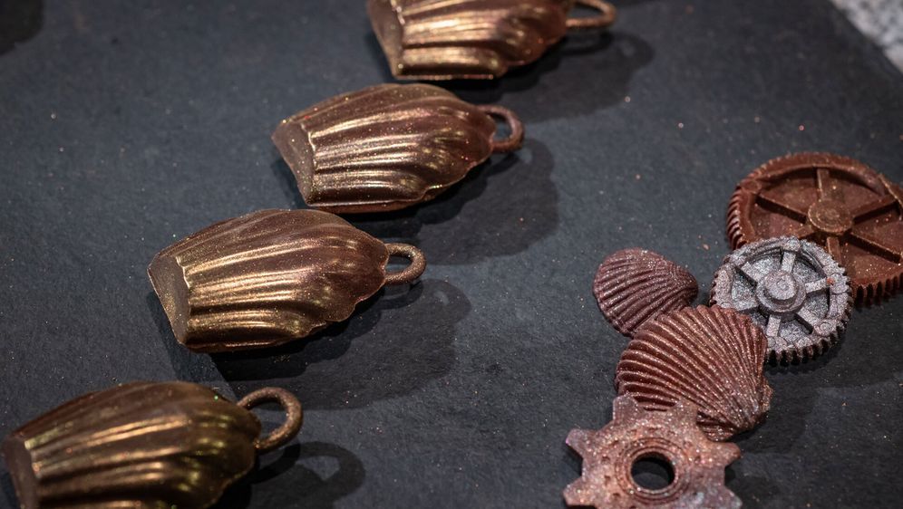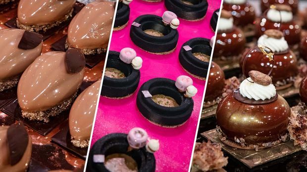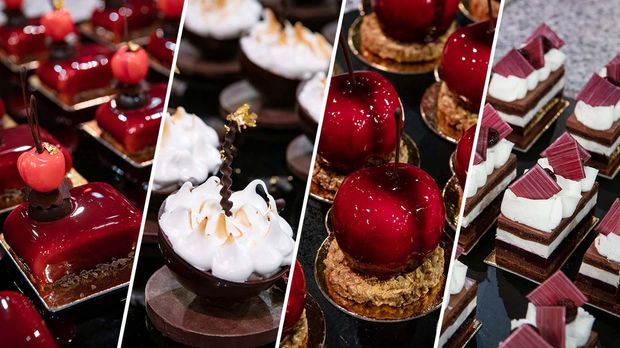 Aufgerollte Äpfel Dulcey-Karamellcreme Schokosteine aus Knusperboden und einer Schokoladen-Himbeer-Mousse Grießflammerie-Schaum Falsche Kirschen Frankfurter Kranz. Das große Backen - Die Profis Pralinen-Selektion Team Schwarz Alex und Robin servieren drei leckere Pralinensorten mit Zartbitter-Ganache und Knusperboden fruchtiger Yuzu-Ganache und Mandel gepaart mit Fleur de Sel und Knusperboden. Die Kandidatinnen von Das große Backen Die Profis haben geniale Kniffe in petto.